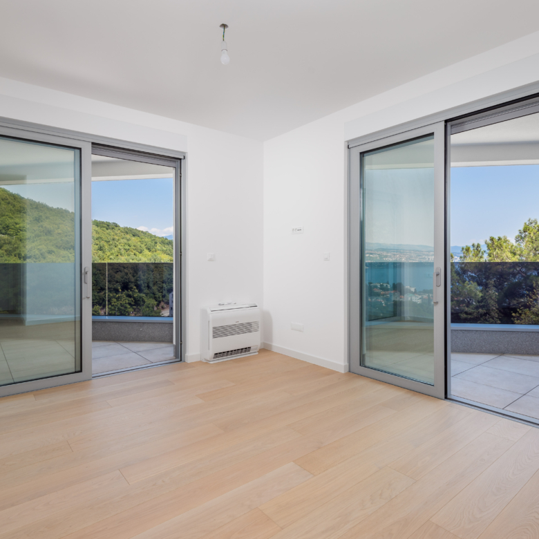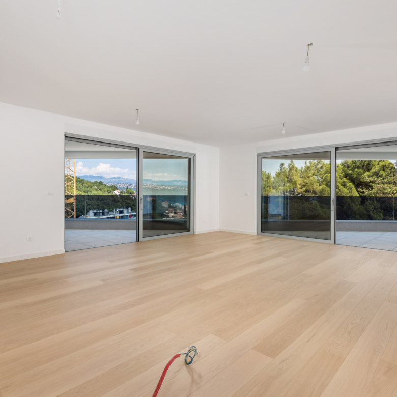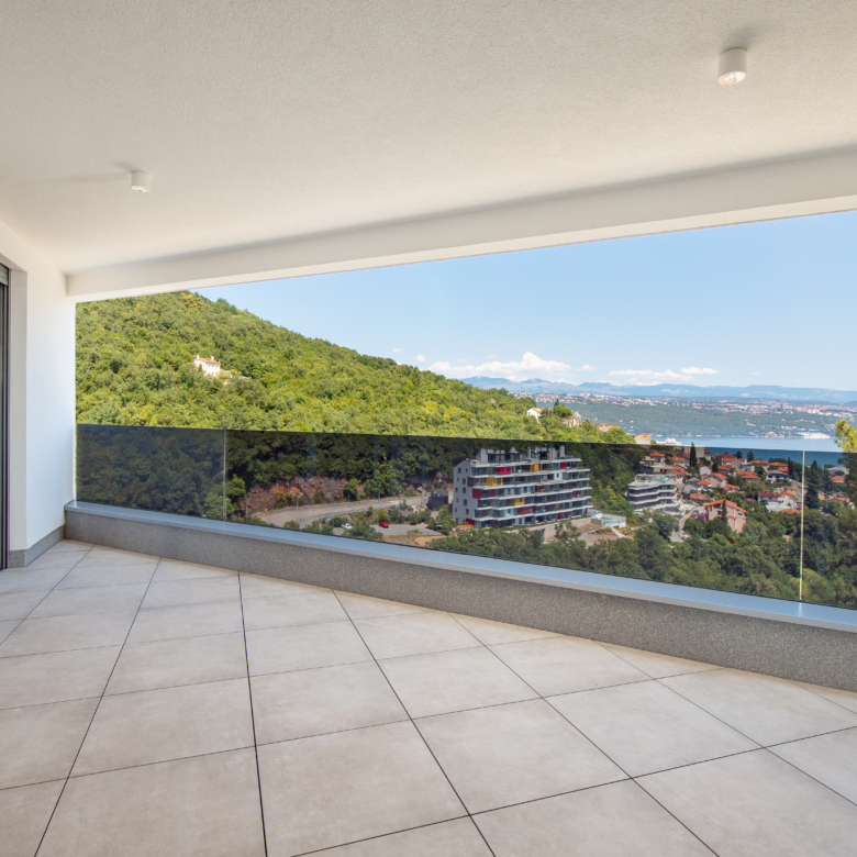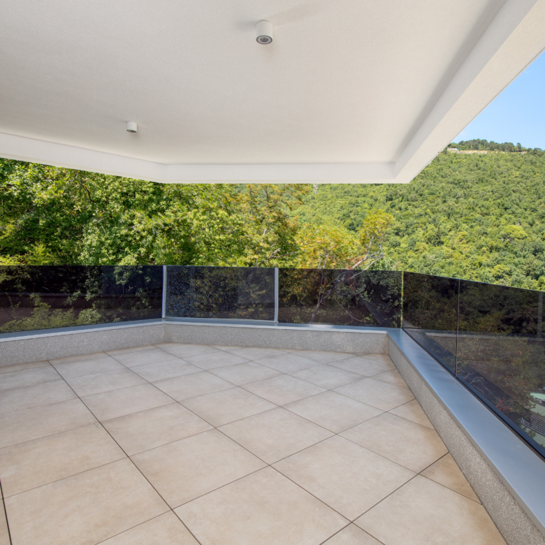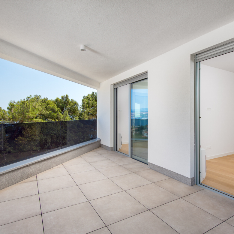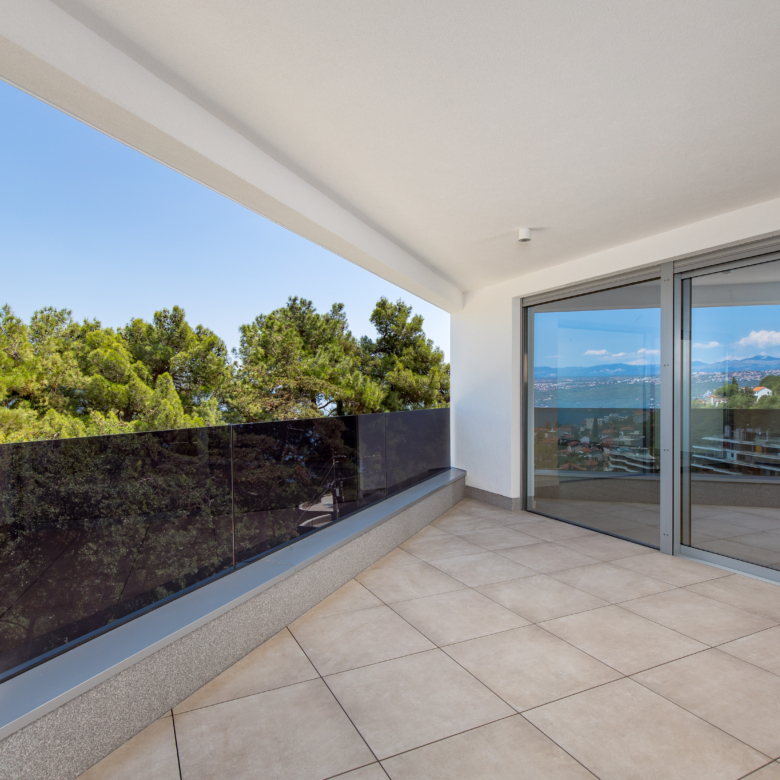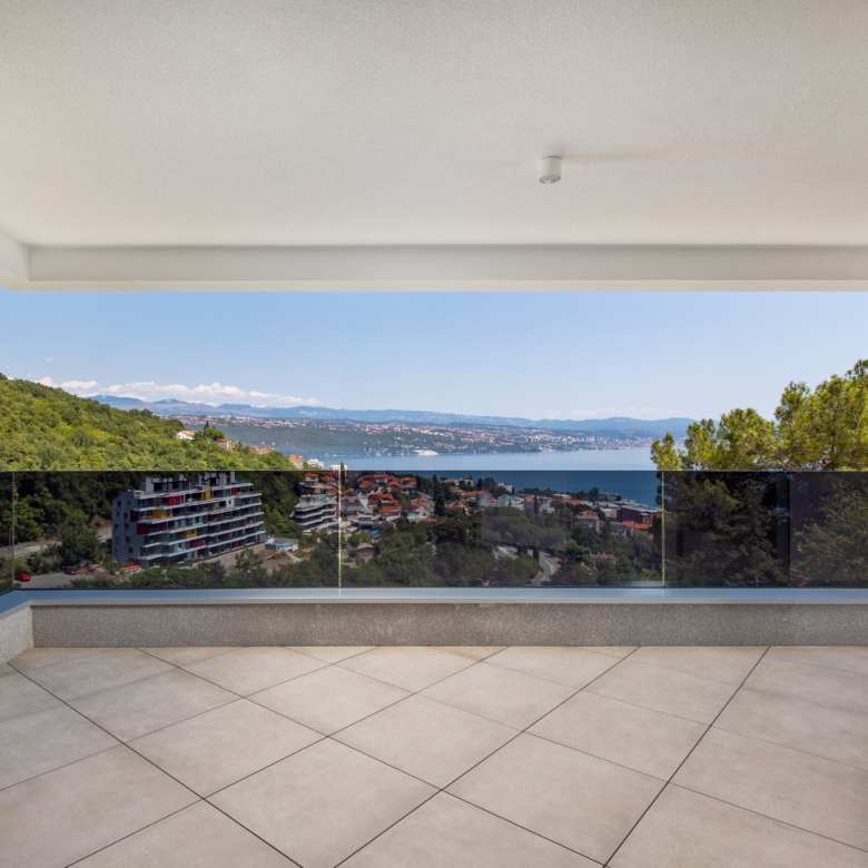 Na drugom katu moderne vile nalazi se prostrani stan ukupne obračunske površine 247 m², s impresivnih 5 balkona ukupne površine 64 m² i otvorenim pogledima prema moru i zelenilu. Glavne značajke stana: 2 dnevna boravka 4 spavaće sobe 4 kupaonice 2 WC-a Unutarnja površina stana: 197 m² Bruto površina stana: 261 m² 5 balkona – ukupno 64 m² 2 garažna te 2 vanjska parkirna mjesta po 12 m² Stan je nenamješten, s neutralnom i suvremenom