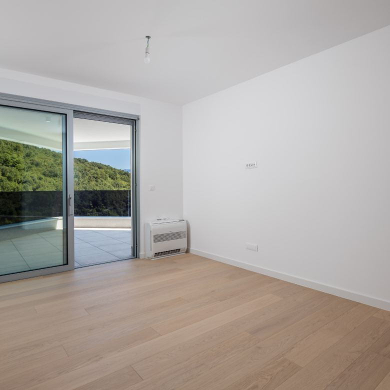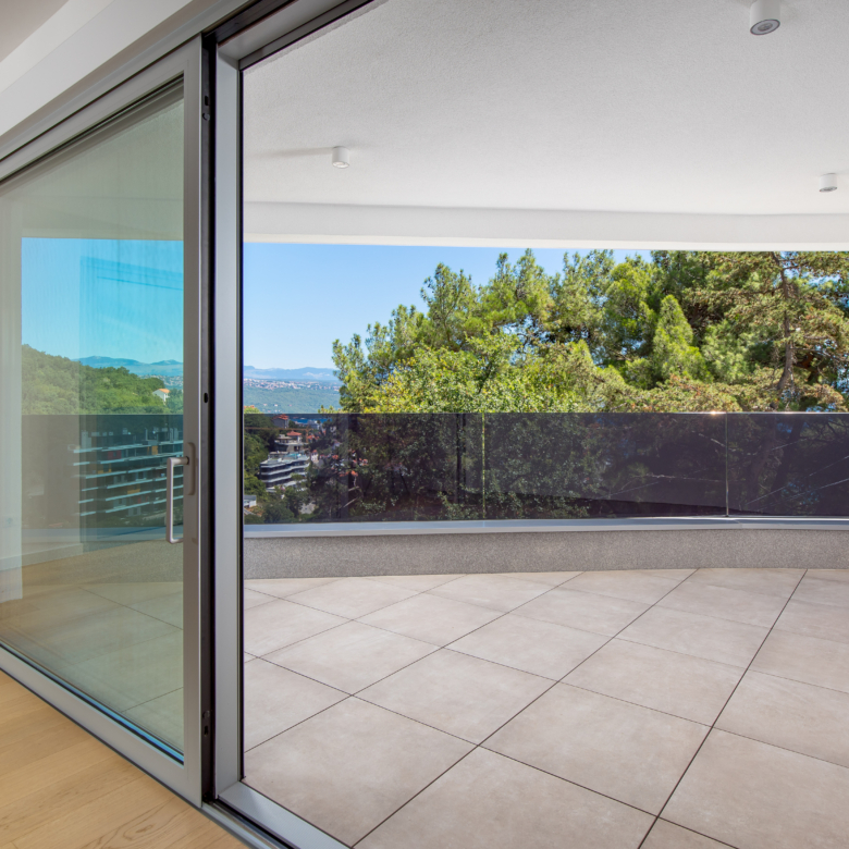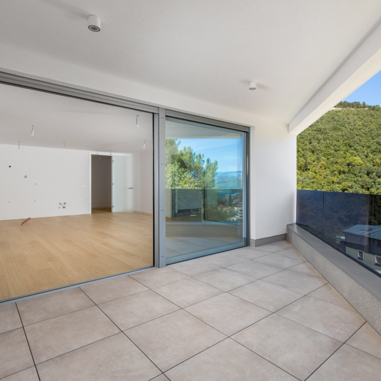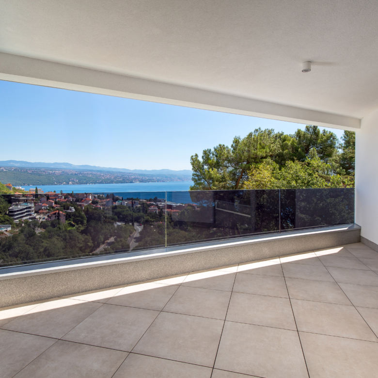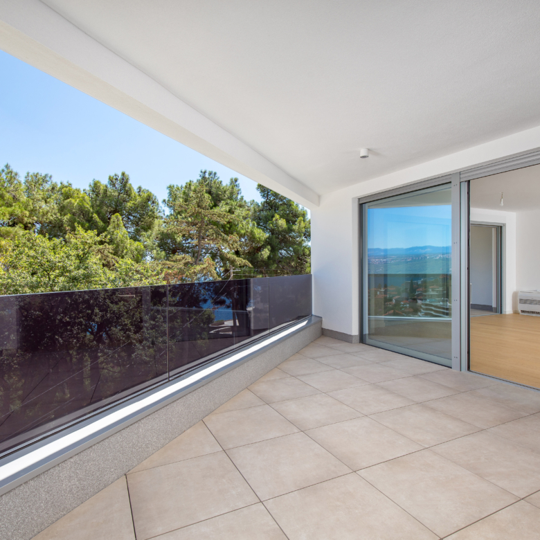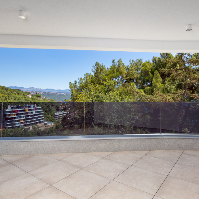 Na prvom katu moderne vile nalazi se prostrani stan ukupne obračunske površine 254 m², s impresivnih 5 balkona ukupne površine 64 m² i otvorenim pogledima prema moru i zelenilu. Glavne značajke stana: 2 dnevna boravka 4 spavaće sobe 4 kupaonice 2 WC-a Unutarnja površina stana: 197 m² Bruto površina stana: 261 m² Vanjski prostori: 5 balkona – ukupno 64 m² Parkiranje i spremišta: 2 garažna parkirna mjesta od 12 m² 2 vanjska parkirna mjesta od