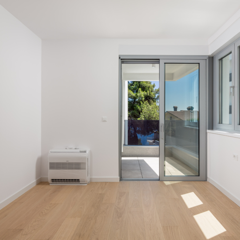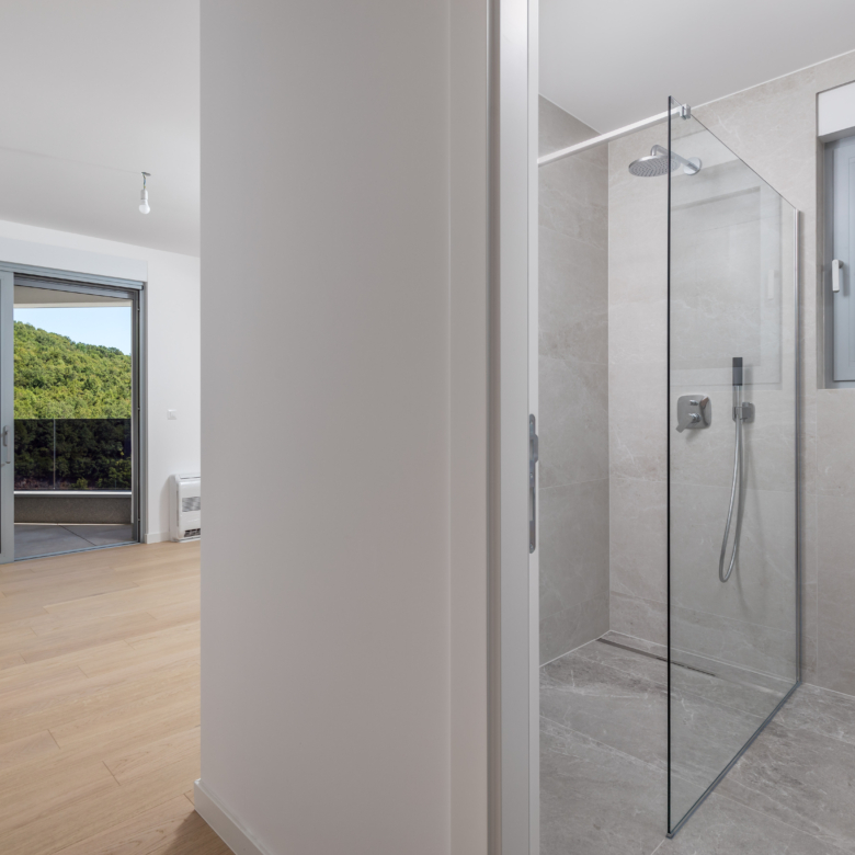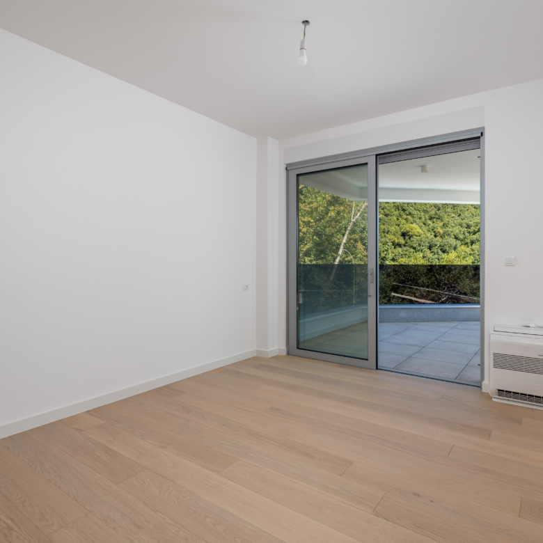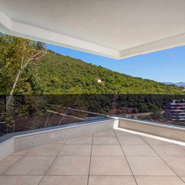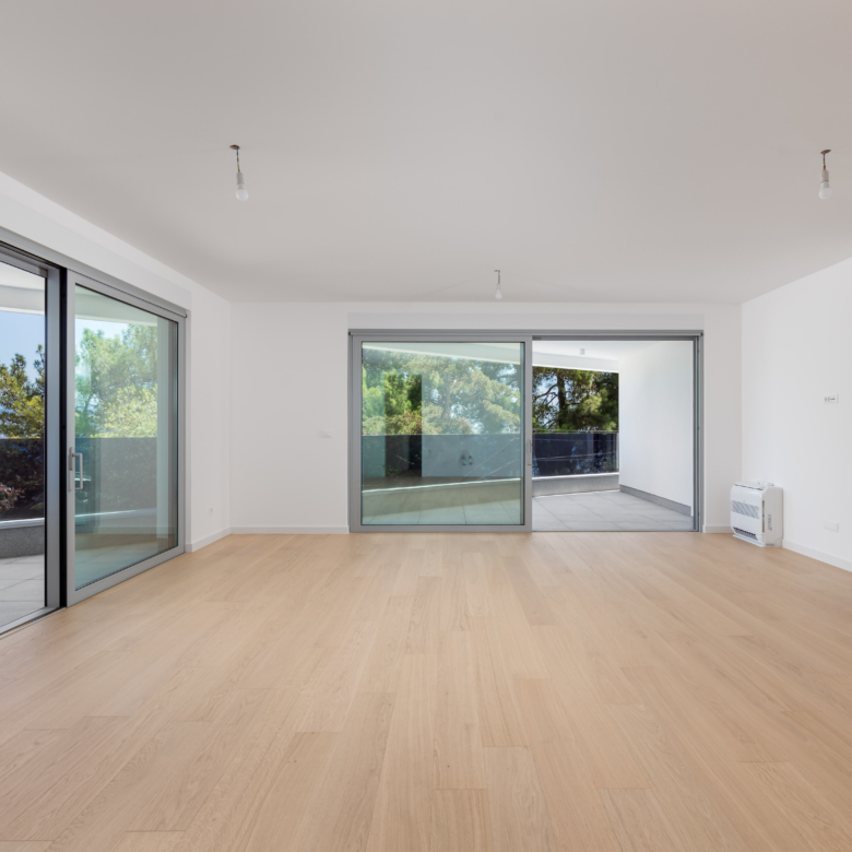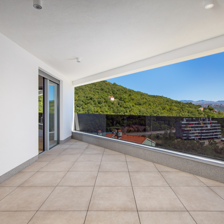 Na prvom katu moderne vile nalazi se prostrani stan ukupne obračunske površine 254 m², s impresivnih 5 balkona ukupne površine 64 m² i otvorenim pogledima prema moru i zelenilu. Glavne značajke stana: 2 dnevna boravka 4 spavaće sobe 4 kupaonice 2 WC-a Unutarnja površina stana: 197 m² Bruto površina stana: 261 m² Vanjski prostori: 5 balkona – ukupno 64 m² Parkiranje i spremišta: 2 garažna parkirna mjesta od 12 m² 2 vanjska parkirna mjesta od